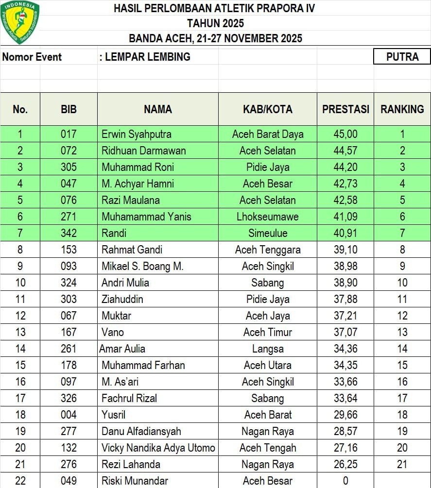 “Persaingan nomor lembing tahun ini sangat ketat. Banyak atlet menunjukkan peningkatan signifikan, dan ini sinyal positif bagi masa depan atletik Aceh,” ujar salah satu panitia pelaksana.