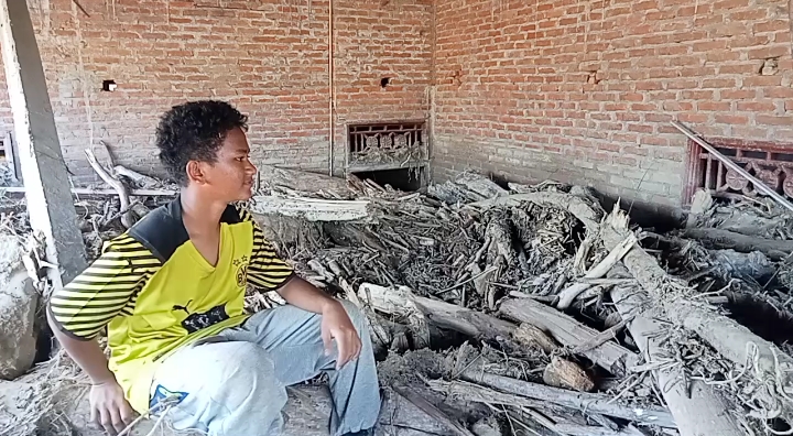 Kayu-kayu besar hanyut tak terkendali. Asraf melihat sendiri bagaimana batang kayu menghantam rumahnya. Dinding pecah, bangunan roboh, lumpur dan air bercampur menghantam segalanya.