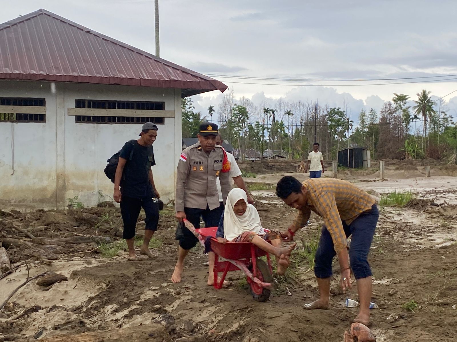 Meski dihadapkan pada berbagai kendala di lapangan, seperti akses jalan utama yang tertutup material kayu dan tidak dapat dilalui kendaraan, personel Polres Pidie Jaya tetap menunjukkan dedikasi tinggi. Dengan memanfaatkan jalur alternatif dan menggunakan gerobak sorong, petugas berhasil mengevakuasi para korban menuju lokasi aman.