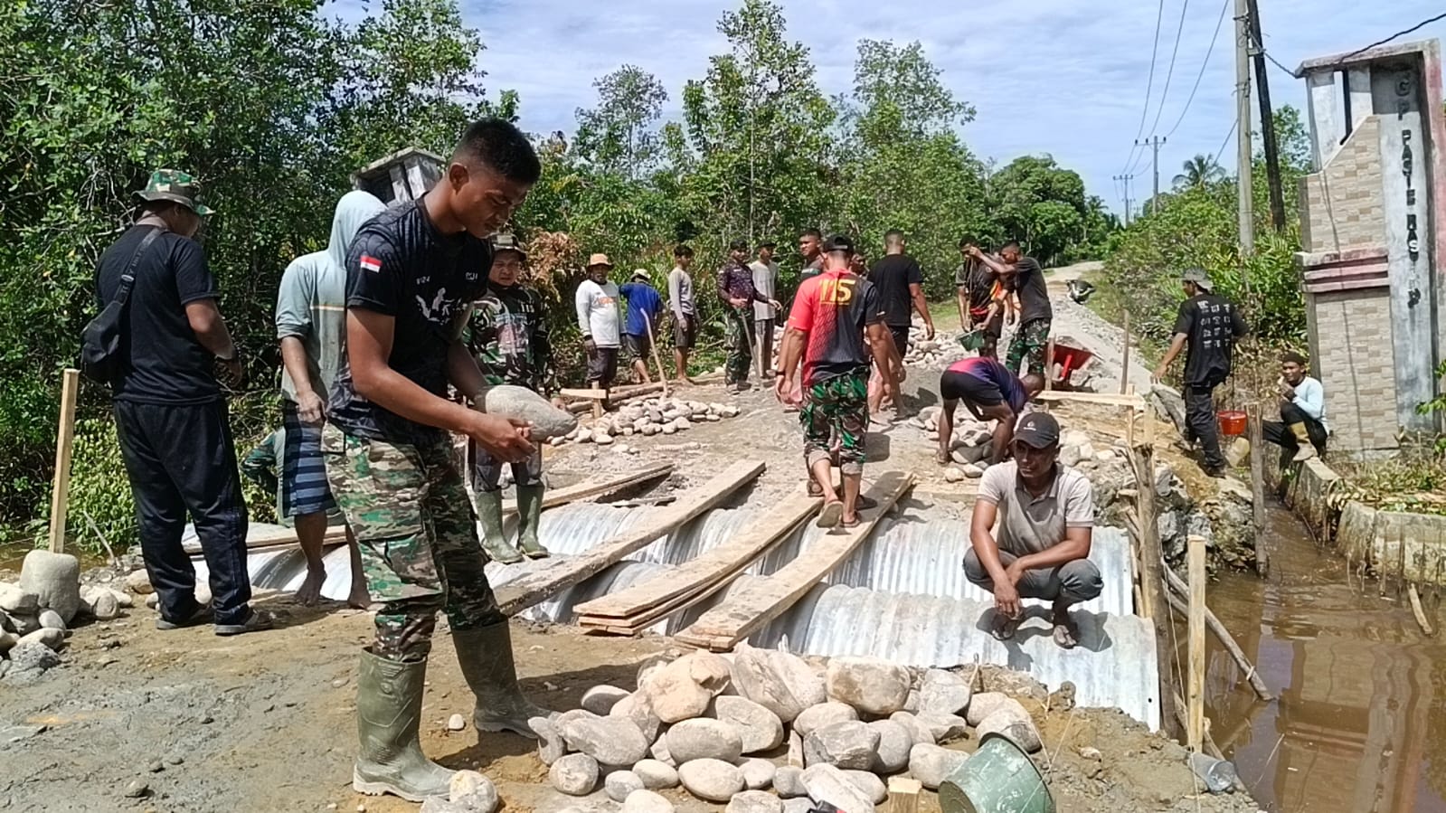 Di lokasi proyek, personel TNI yang tergabung dalam satuan tugas bersama warga terlihat bergotong royong menyelesaikan pekerjaan. Kolaborasi itu dinilai mempercepat progres pembangunan sekaligus mencerminkan sinergi antara aparat dan masyarakat.